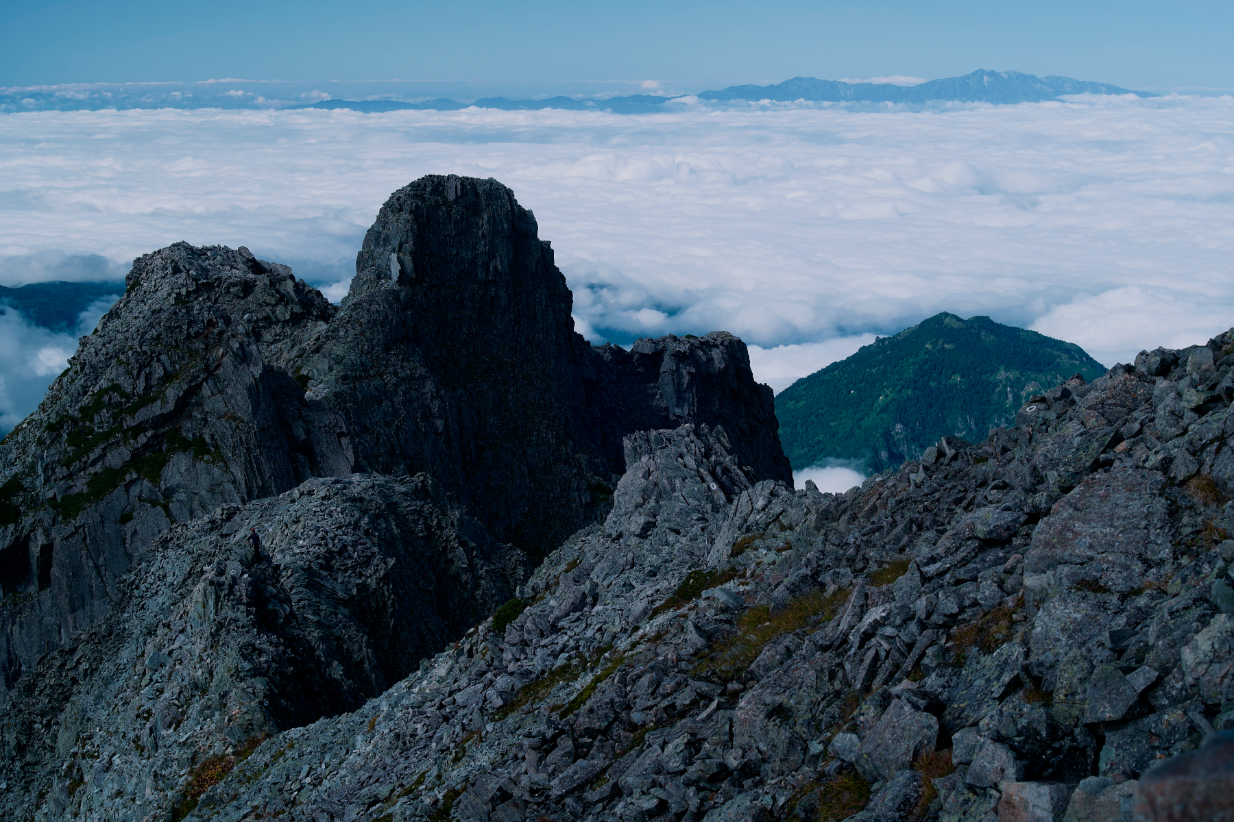 ![]() 奥穂頂上でご来光を迎えようと登る登山者 北穂高岳から南方 |